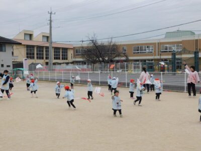 20日(火)年少クラスでは凧揚げをしてみんなで楽しみました。風が少し強かったために糸の調節をしながら行いました。子どもたちは「あがった~、あがった~」と大喜びでした。次回の凧揚げも