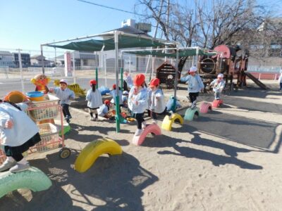 大寒に入ってからずうっと寒い日が続いておりましたが、23日(金)は穏やかな日和となりました。子どもたちは園庭を走ったり、砂場あそびや遊具でのあそびをたのしみました。砂場では穴を掘っ