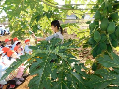 今日は日差したっぷりでポカポカ陽気になりました。そんななか全学年でパパイヤの収穫に農園に出かけました。今年も大豊作、1本の樹には大小のパパイヤが40個~50個も付いていました。子ど