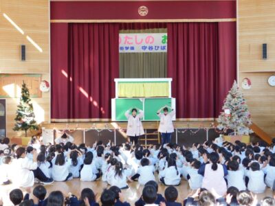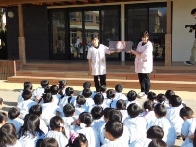 昨日にひき続いて今日もクリスマス会がありました。子どもたちは昼食が終わると、みんなわくわくです。「どんなクリスマスのお話なのかな?」「はやく見たい~」と待ちきれない様子でした。今日