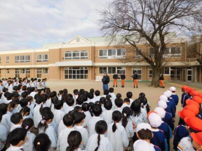 19日(金)消防隊員の皆さんにご来園いただき、火災を想定した総合消防訓練を行いました。子どもたちは、「お・か・し・も・ち」「おさない、かけない、しゃべらない、もどらない、ちかづかな