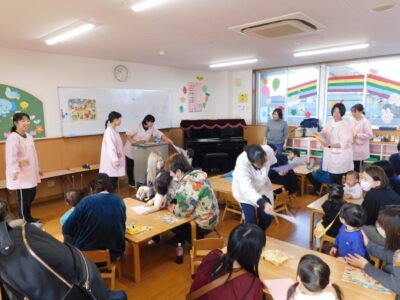 29日(土)未就園児教室のなかよしランドがありました。大勢のお友だちに参加いただき楽しく行うことができました。今日は季節のシール貼りあそびや手作りおもちゃ(動物カスタネット)、お誕