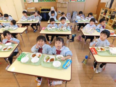 子どもたちは給食の時間がとてもたのしみです。寒くなってくるとあたたかいご飯やスープが格別です。今日の献立はご飯、スープ、はんぺんフライ、ミートボール、シェルマカロニサラダでした。「