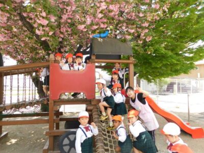 今日は朝から気持ちのよい晴天です。子どもたちは園庭遊具で遊んだり、砂場あそびをしたり、園庭では風に吹かれて舞い落ちる桜の花びらを集めて楽しむ子どもたち。今の季節でしか味わえないたの