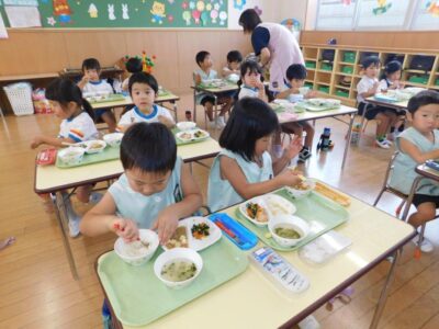29日(月)9月も終わりとはいえ気温の高い一日でした。子どもたちは園庭あそびやスポーツフェスティバルの練習を頑張りました。昼食はご飯、清まし汁、まばるのみそマヨ焼き、鶏つくね、彩り