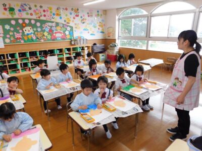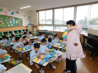 5月の子どもの日(端午の節句)にちなんで先週はこいのぼりの吹き流しの製作を行いました。年長組になると絵の具での色塗りも上手です。牛乳パックに紙を貼って絵の具で色塗りをして立体感のあ