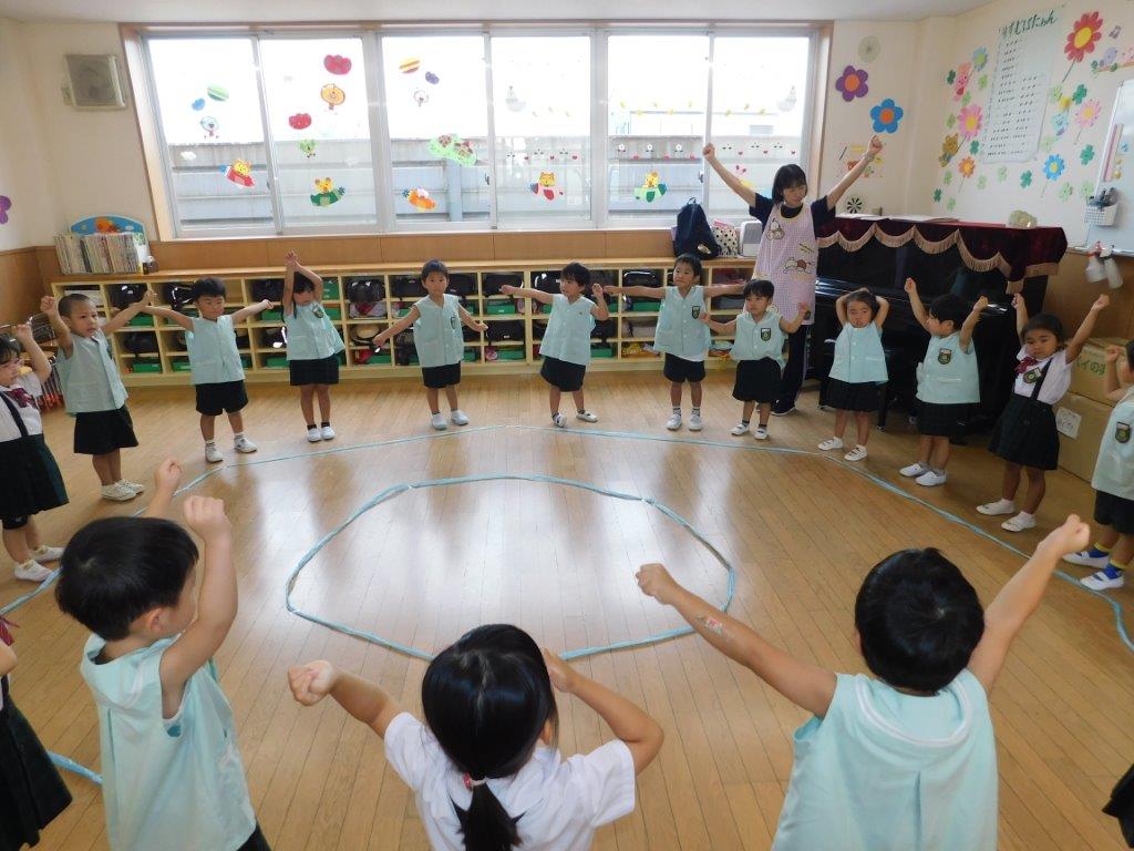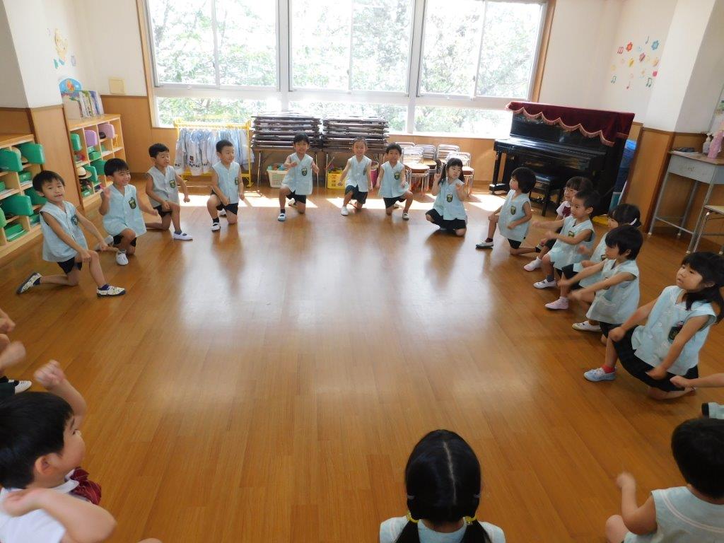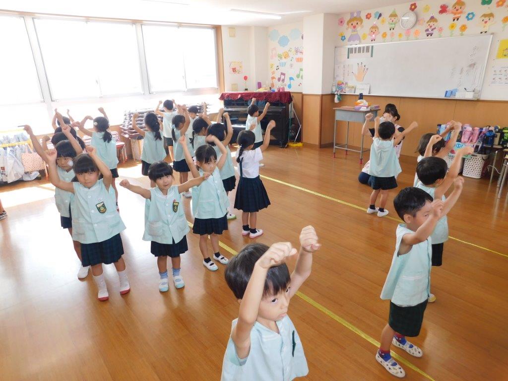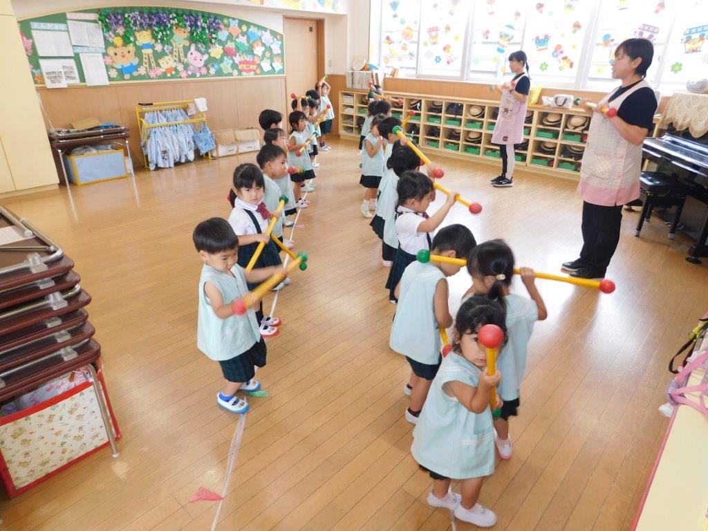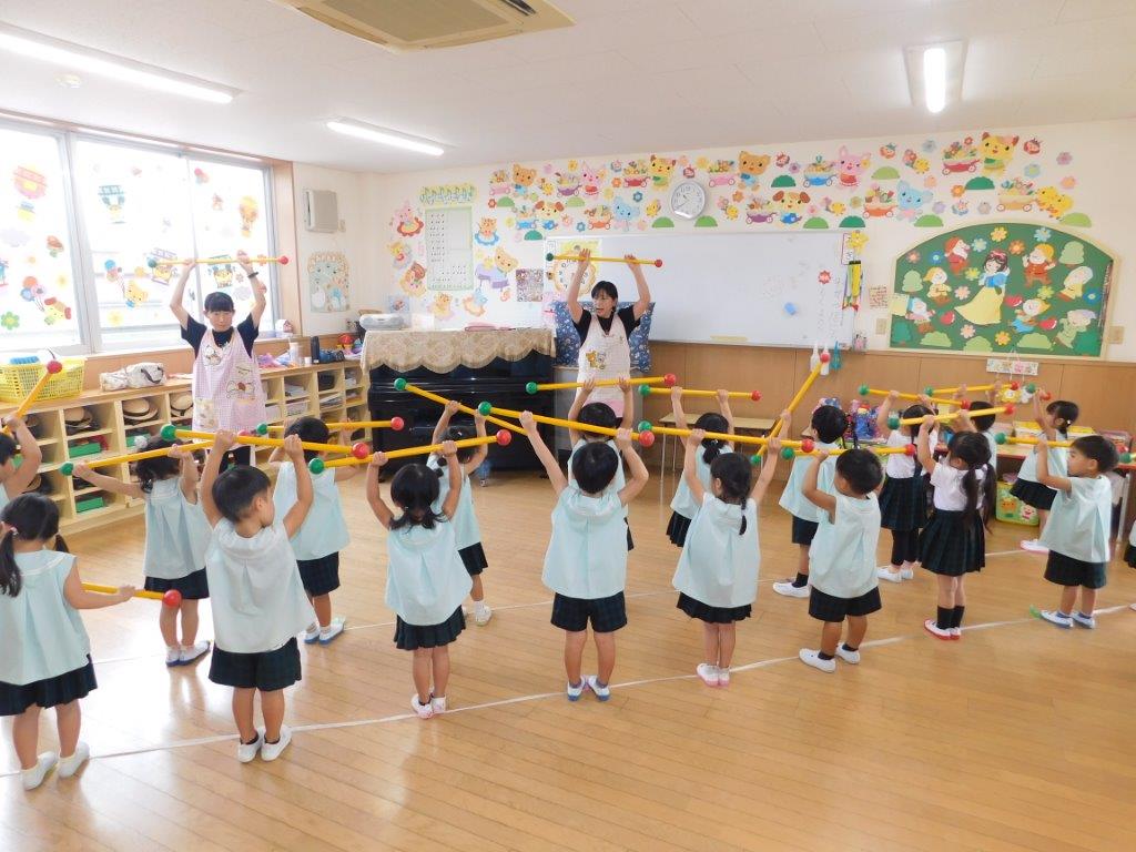 年々少、年少、年中クラスでは、スポーツフェスティバルに向けて練習を頑張りました。年少クラスでは棒体操の練習やおゆうぎの練習、年中クラスでは、お遊戯やパラバルーンの練習を行いました。みんなでかけ声をかけながら元気いっぱいできました。年長クラスは組体操の練習を頑張りました。少しずつ形づくりが上手にできるようになりました。