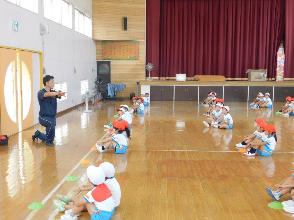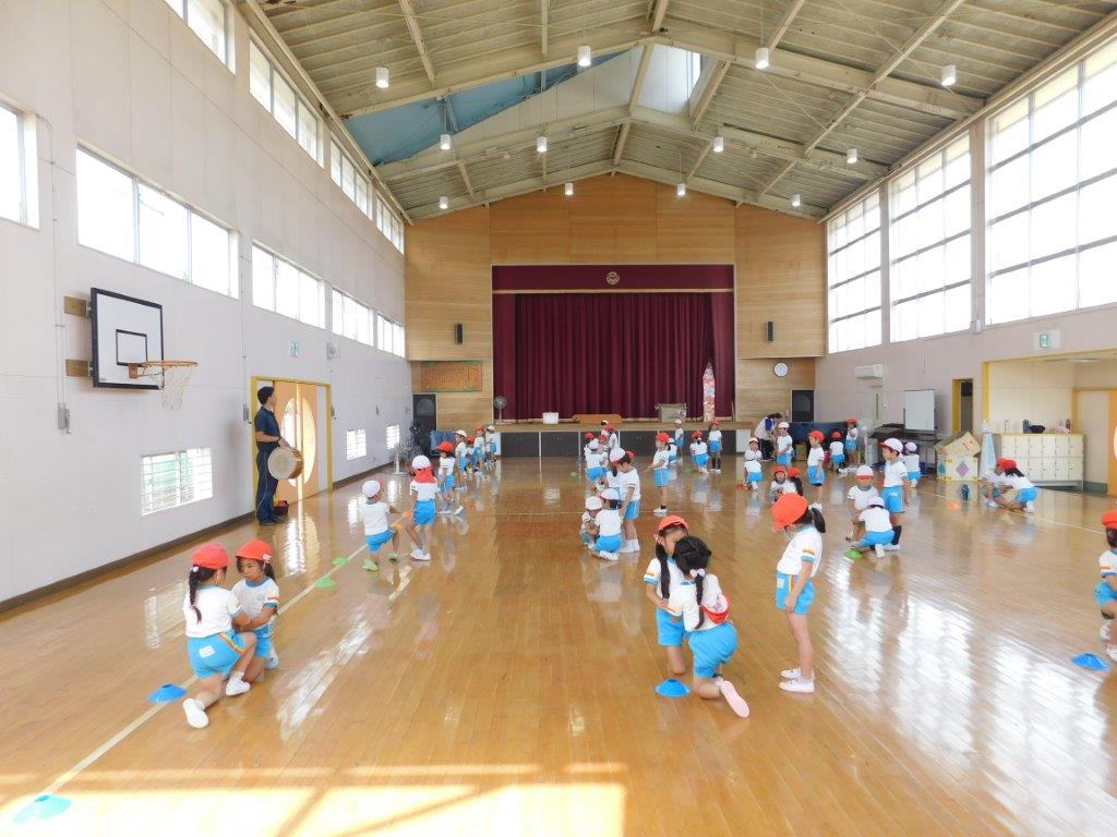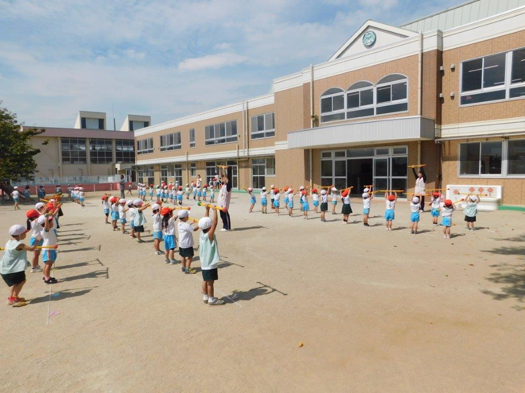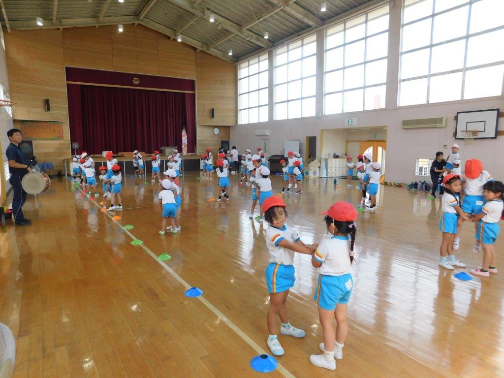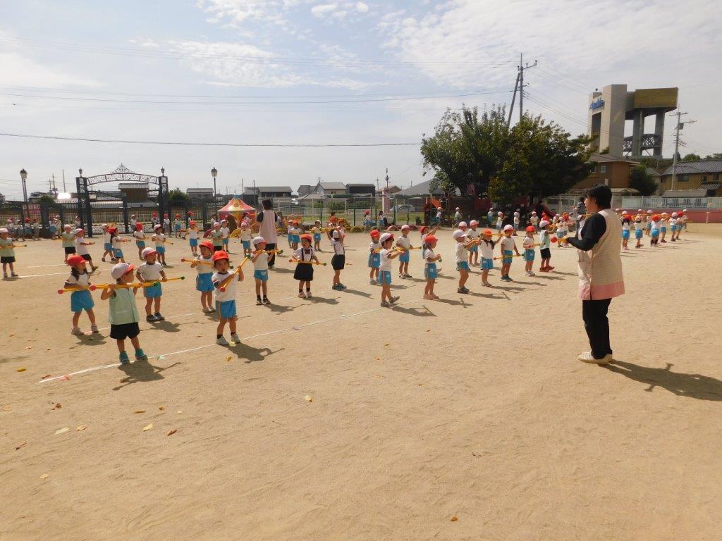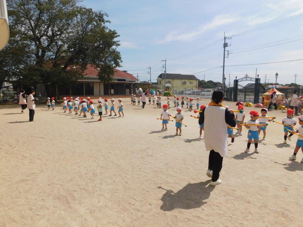 25日(木)秋晴れの晴天の中、スポーツフェスティバルに向けて練習を行いました。年々少、年少組はお遊戯や棒体操、年中組はパラバルーン、年長組は組体操を行いました。練習できるのもあと2週間余りです。一つひとつ種目の確認を行いながらくり返し練習を頑張りました。年長組担当の体育の講師からは、練習を行っていく中で大ぶ上手になりました。自信をもって頑張っていきましょう。と、褒められると子どもたちはにこにこ笑顔、また明日からの練習も楽しみながら行えることと思います。
