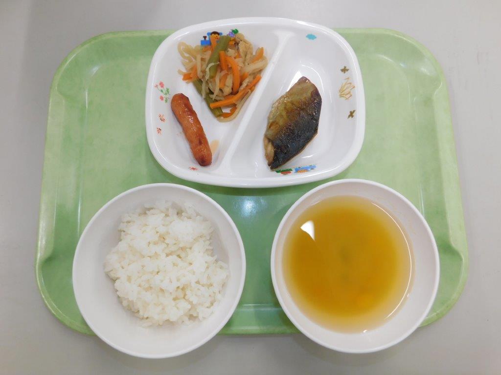 昼食はご飯、味噌汁、アジのみりん醤油焼き、切干大根の煮もの、ウインナーでした。