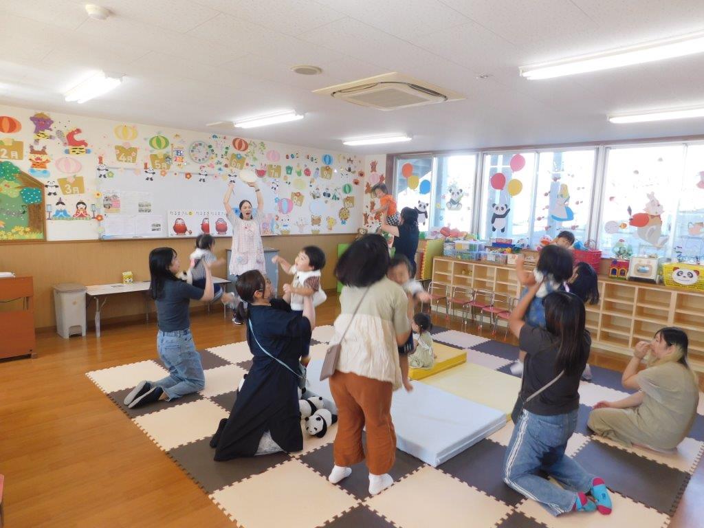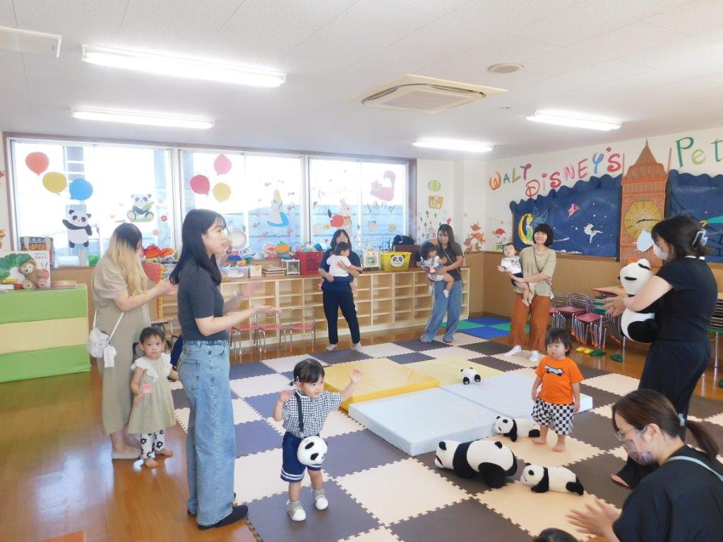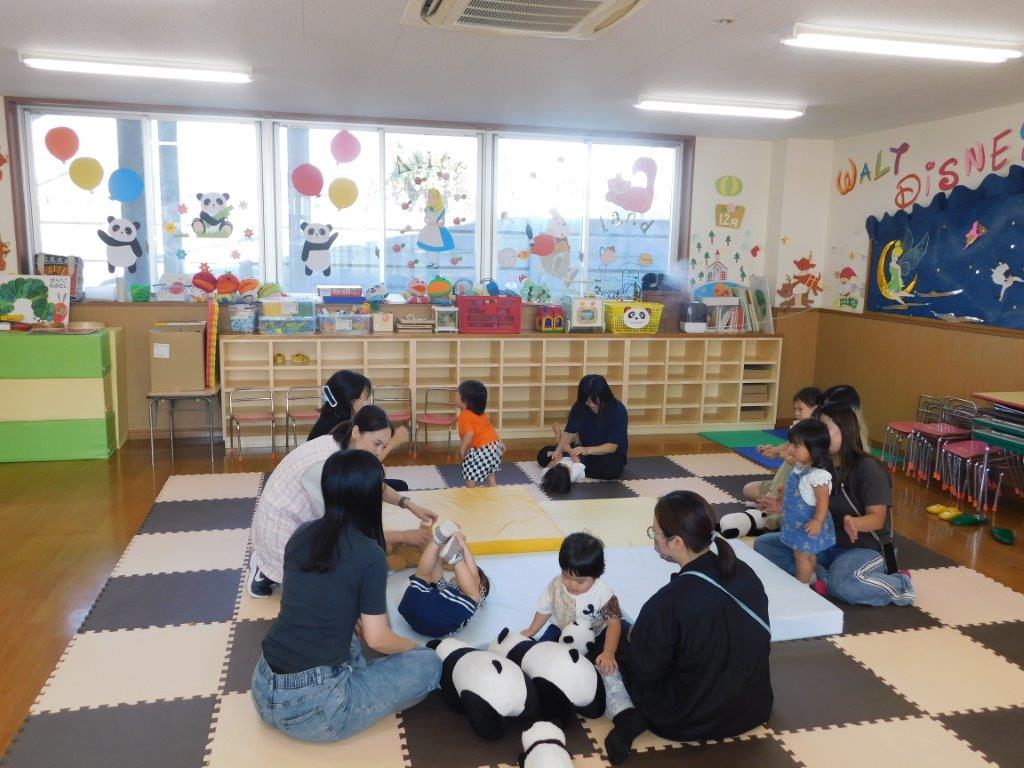 今日(26日)も楽しいぱんだコースがありました。お子さま方の大好きな「大きなたいこ」や「バスに乗ってゴーゴー」のリトミックあそびを楽しみました。「バスに乗ってゴーゴー」では、実際にお母さまの膝の上にのってバスを運転しているかのように右へ、左へ、坂道を登ったり、急に下ったり、ピアノ伴奏に合わせて楽しく行いました。お子さま方も楽しくなって思わずにこにこ笑顔になりました。とても楽しい活動でした。