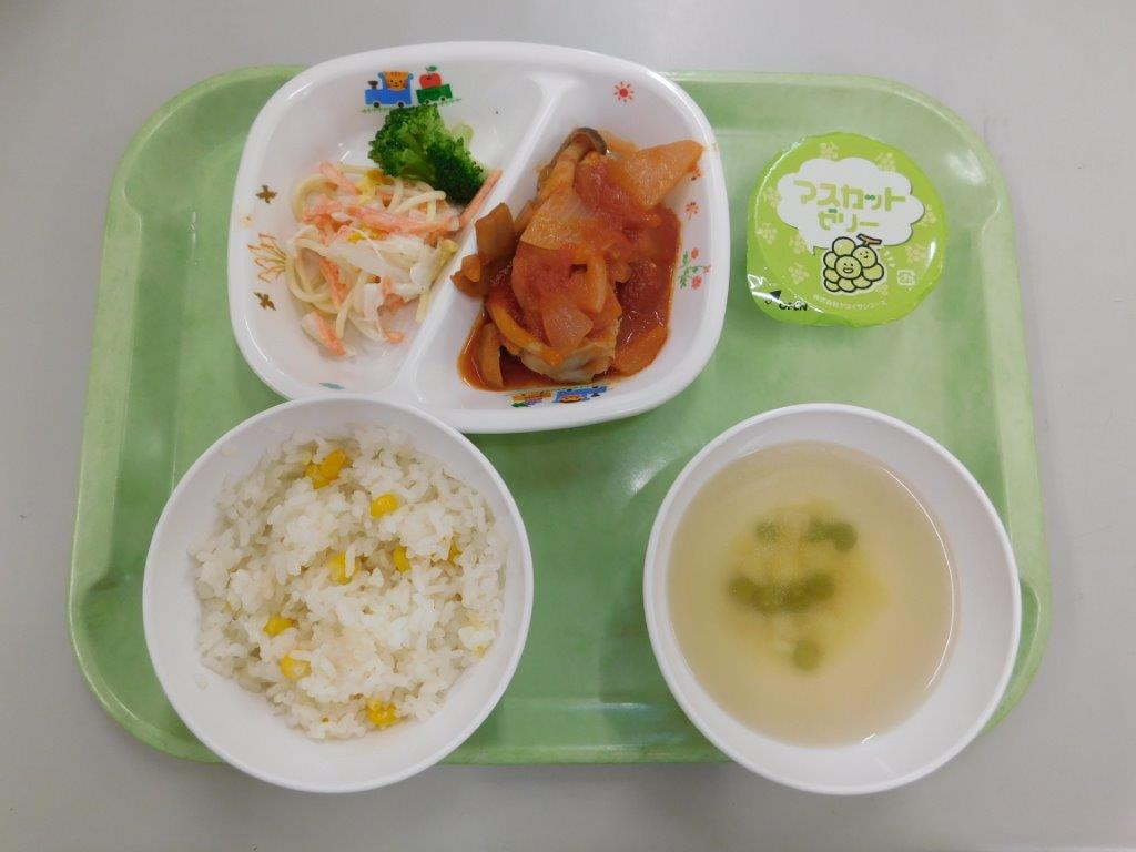 給食はお誕生日メニューでした。コーンライス、スープ。チキンとトマトの煮込み、スパゲティサラダ、マスカットゼリーでした。おいしくいただきました。