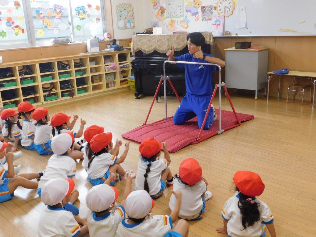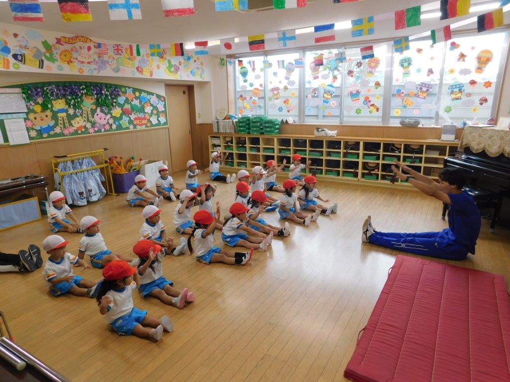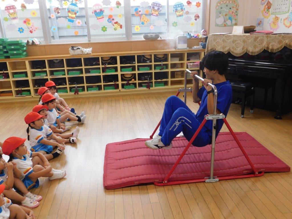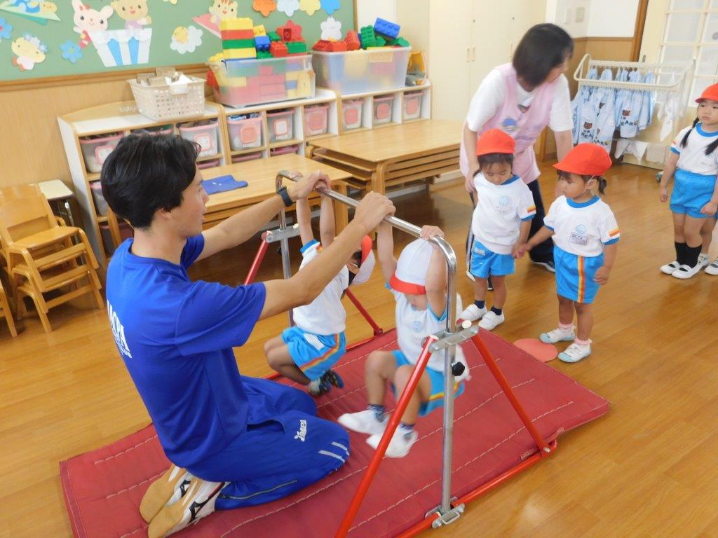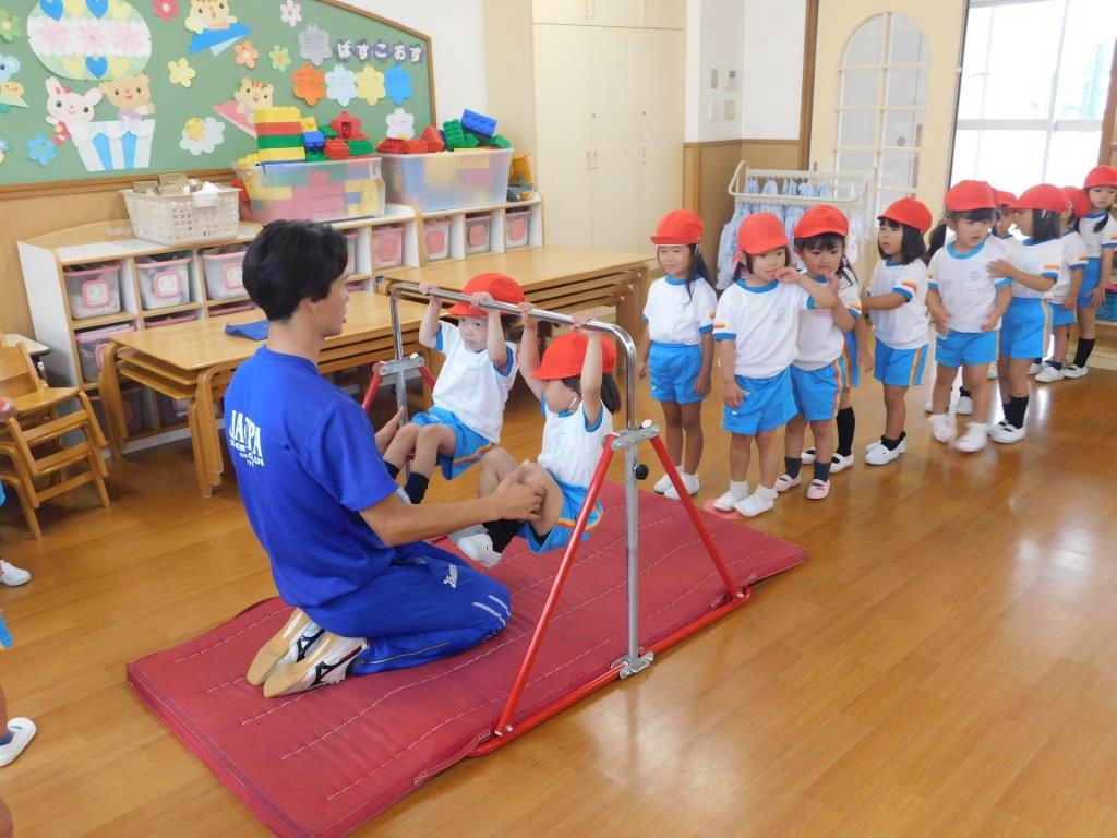 今日は年々少、年少組の体育教室、運動あそび(鉄棒)を行いました。鉄棒の握り方、腕力を強くするぶらさがりの練習を行いました。体育講師から「上手に鉄棒握れているね!」「上手だね」と褒められると、子どもはちはにこにこ笑顔、とても嬉しそうでした。次回も鉄棒、マット運動楽しみたいと思います。