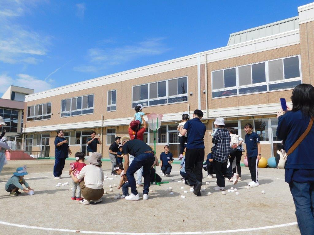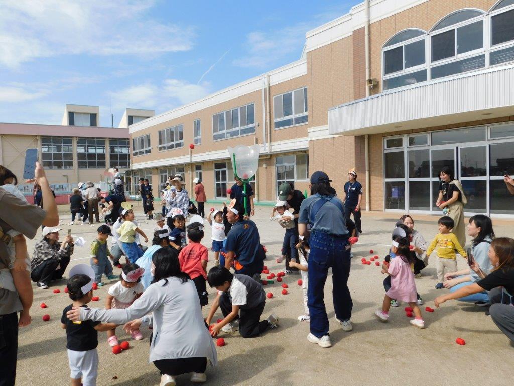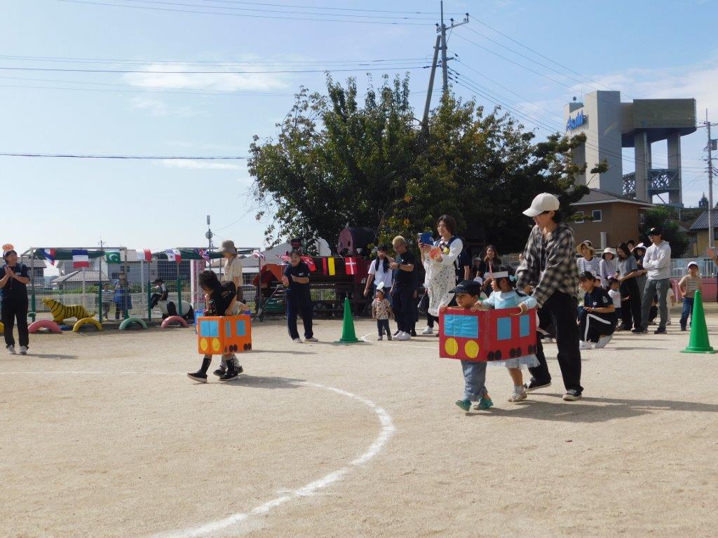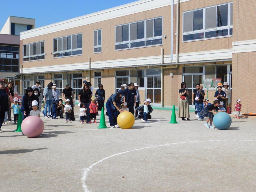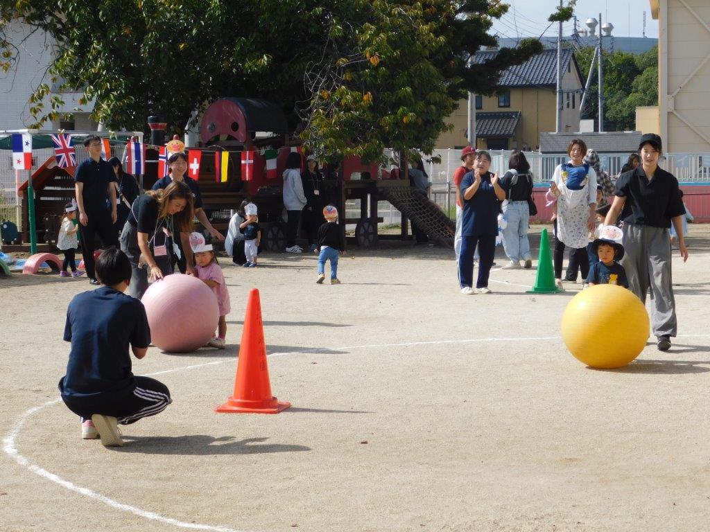 その後は玉入れや電車リレー、大玉ころがし、かけっこなどどの種目も楽しくできました。最後のかけっこが終わると先生方からお友だちに嬉しいおみやげのプレゼントがありました。先生から「がんばったね」と手渡されると゛ありがとう゛とお友だちの可愛い笑顔が輝いていましたね。思い出いっぱいのミニミニ運動会でした。