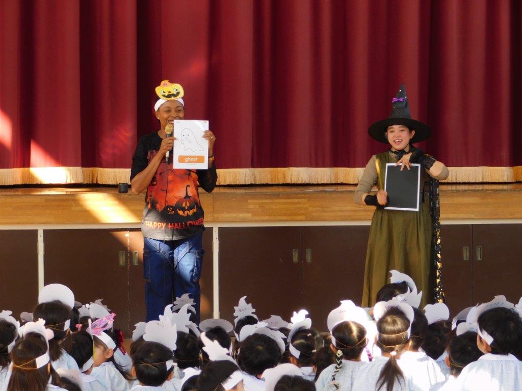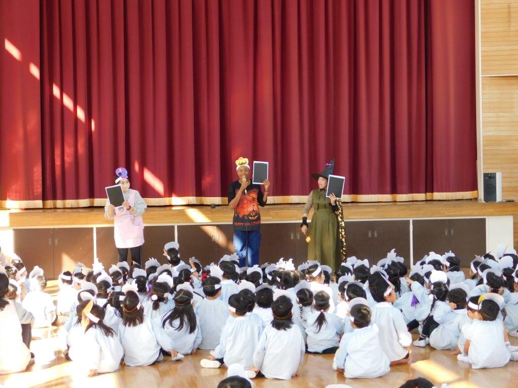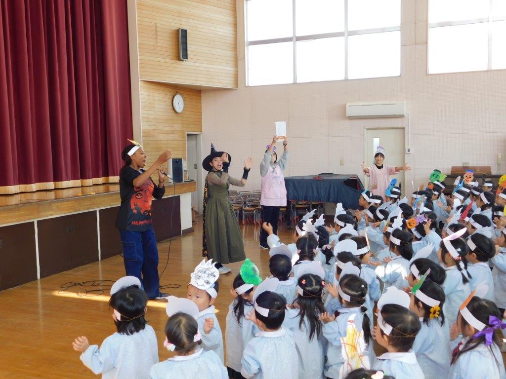 今日は一人ひとり手作りのハロウィンお面をつけておたのしみ会を行いました。はじめに英語講師のオサス講師とピア講師がハロウィンの衣装をまとって単語ゲームやハロウィンダンス、カードゲーム(フラッシュカード)などを行いみんなで楽しみました。最後にハロウィンの由来、(夜の町にさまよう悪霊を遠ざけるため、悪霊がお菓子がほしい Trick or Treat!)お菓子をくれないといたずらしちゃうよ。とやってきたら、お菓子をあげて帰ってもらう習慣があることもお話していただきました。