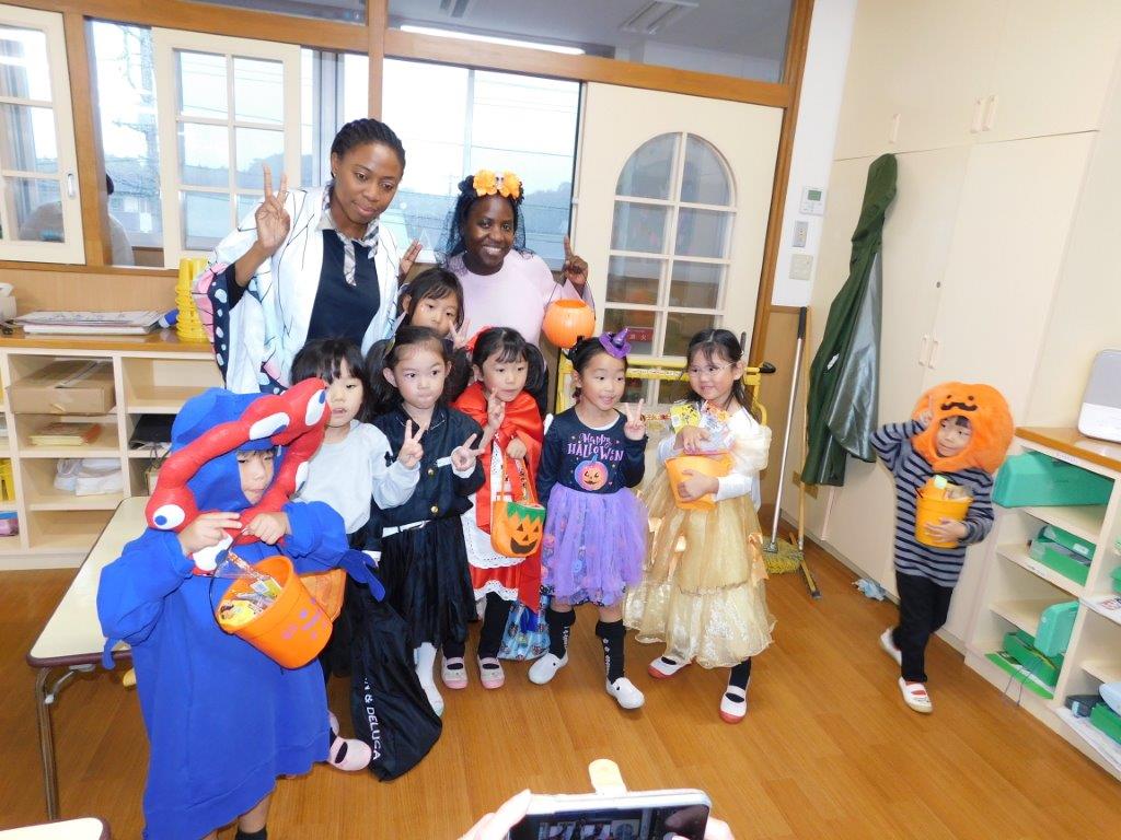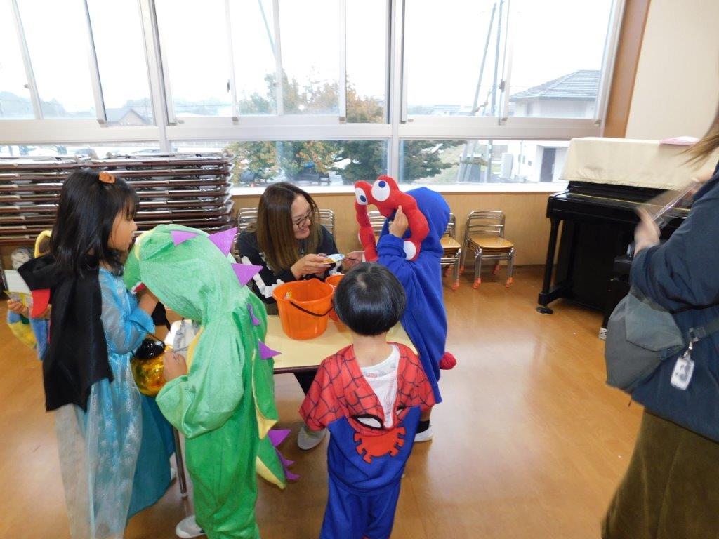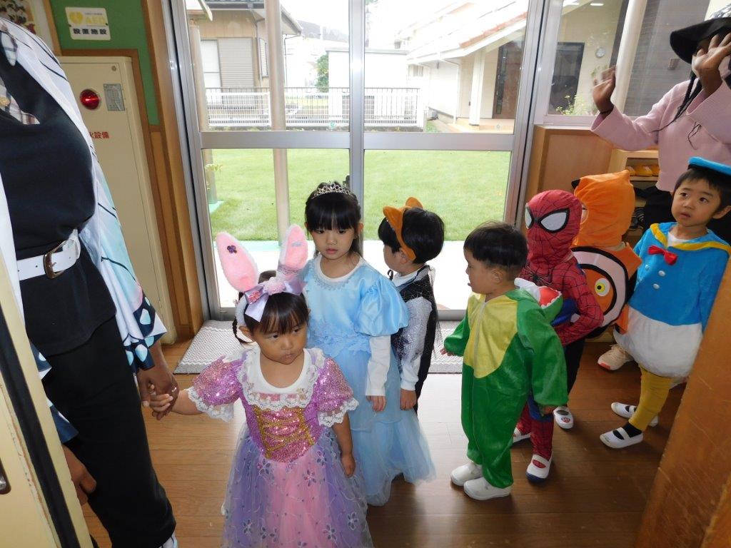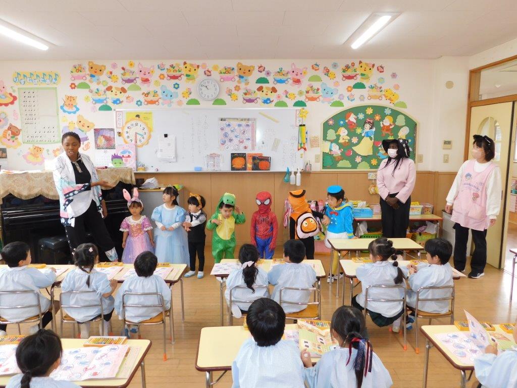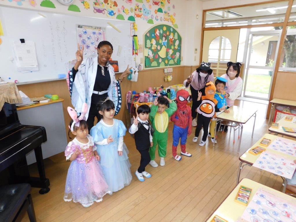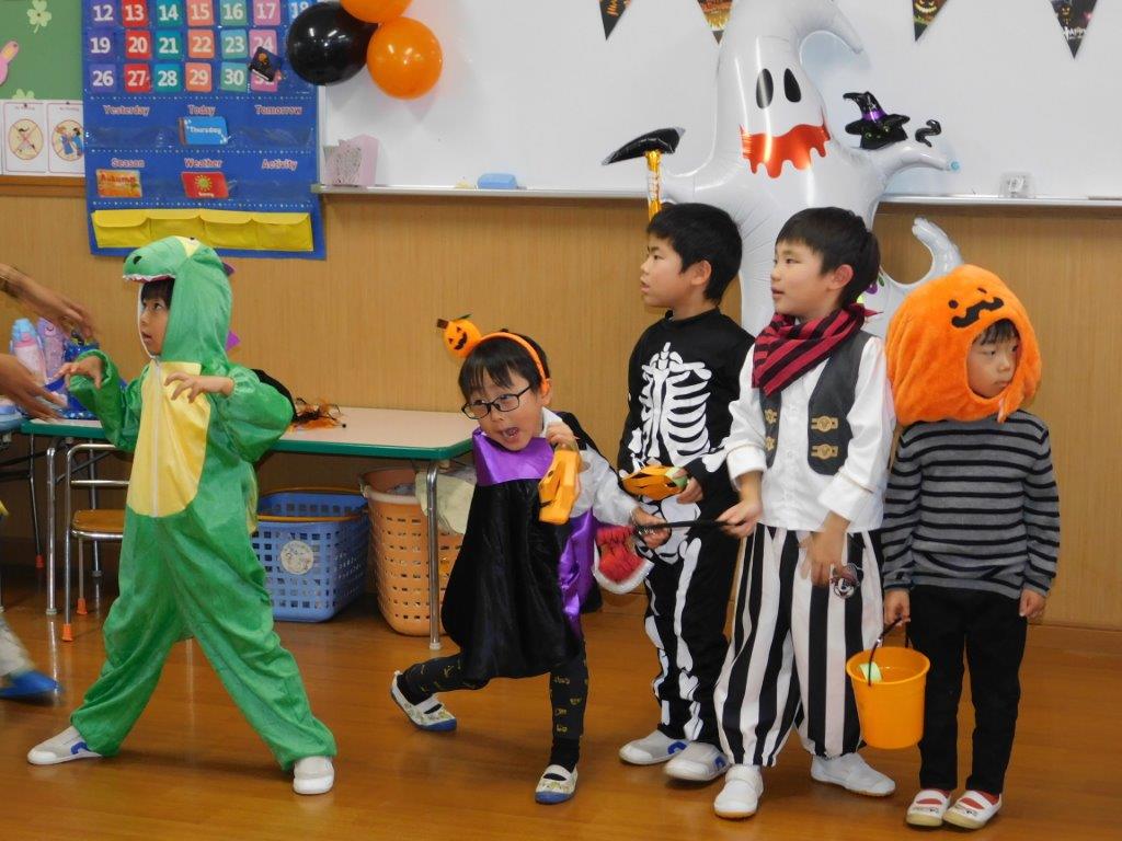今日31日はハロウィンです。SKYクラスの子どもたちはハロウィン衣装に仮装してお菓子をくれないとわるさしちょうよ!「Trick or  Treat」と言いながら各クラスをまわりました。クラスの子どもたちはびっくり「シンデレラだ~、スパイダーマンもいる、ドナルド、怪獣レックスもいるよ」と、大興奮気味でした。今日は各クラスでもハロウィンにちなんでの絵本の読み聞かせなどを行いたのしい一日を過ごしました。