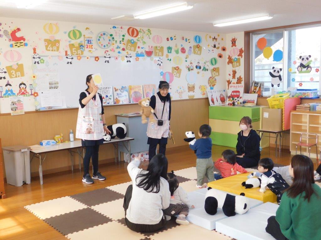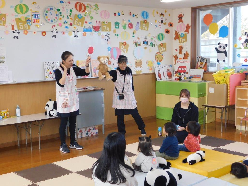 カードを使用しての絵カードあそび、ピアノ伴奏とともに始まる絵本の読み聞かせな
