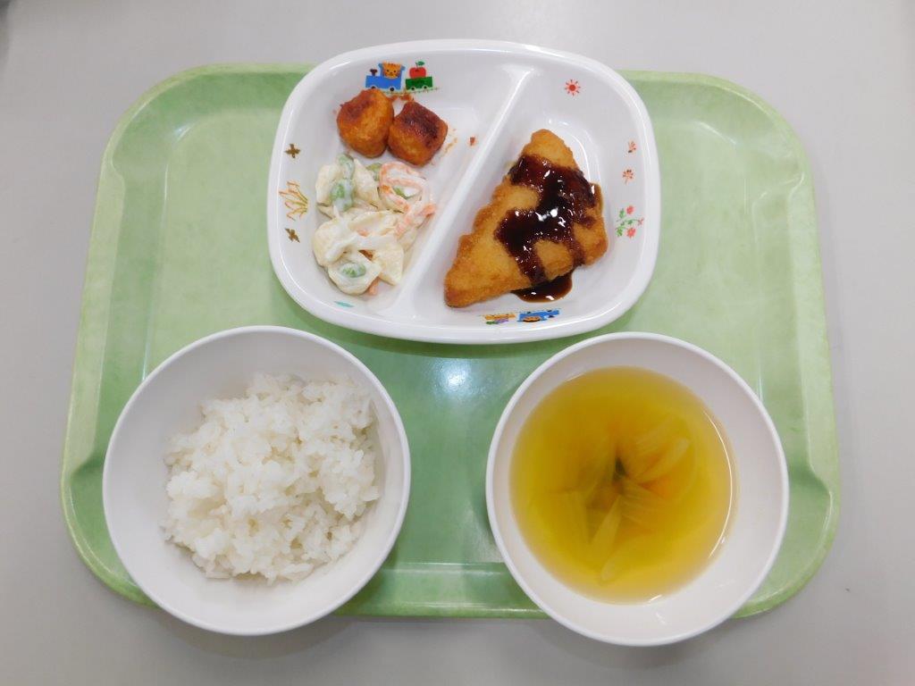 今日の献立はご飯、スープ、はんぺんフライ、ミートボール、シェルマカロニサラダ