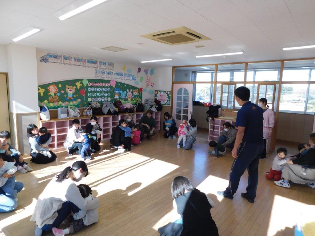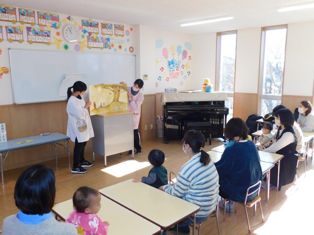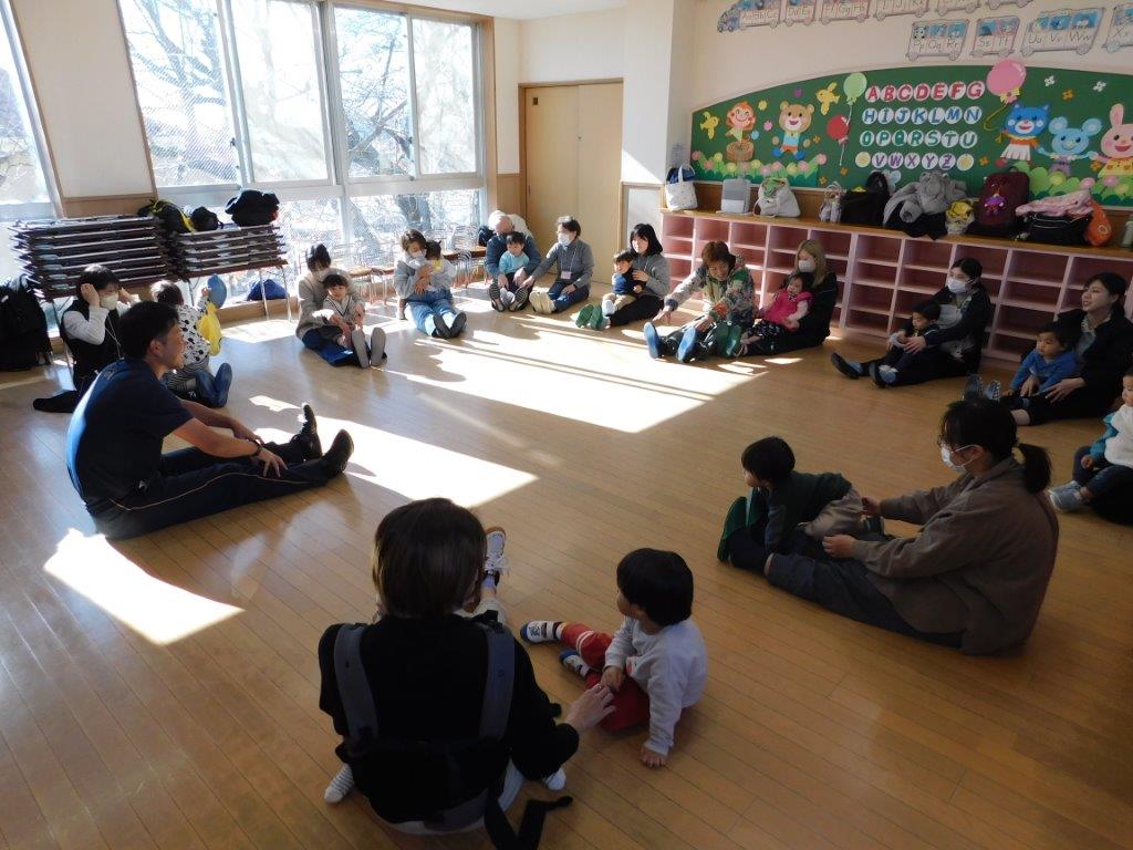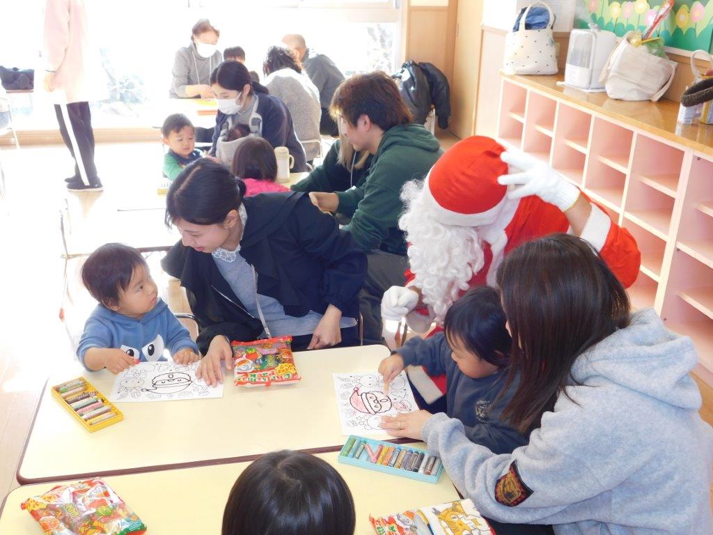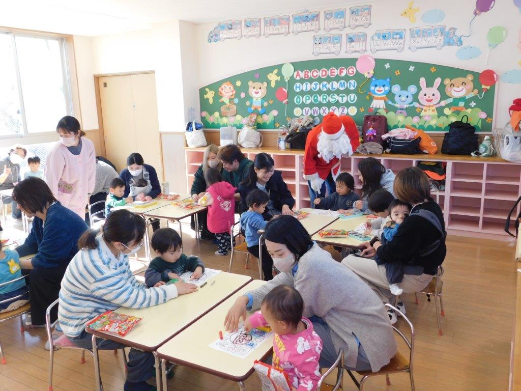 体育の先生と一緒に親子体操やクリスマスのぬり絵あそび、大型絵本の読み聞かせを