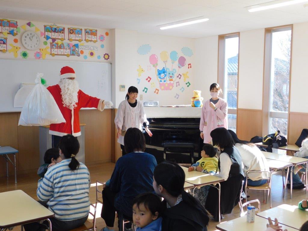 うのサンタクロースがクリスマスとまちがえてひと足早くやって来ました。子どもた