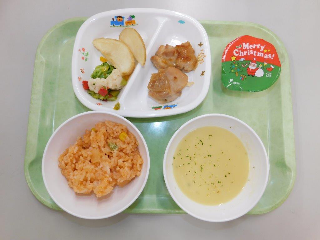 今日の給食はクリスマスメニュー、ケチャップライス、コーンポタージュ、ロースト