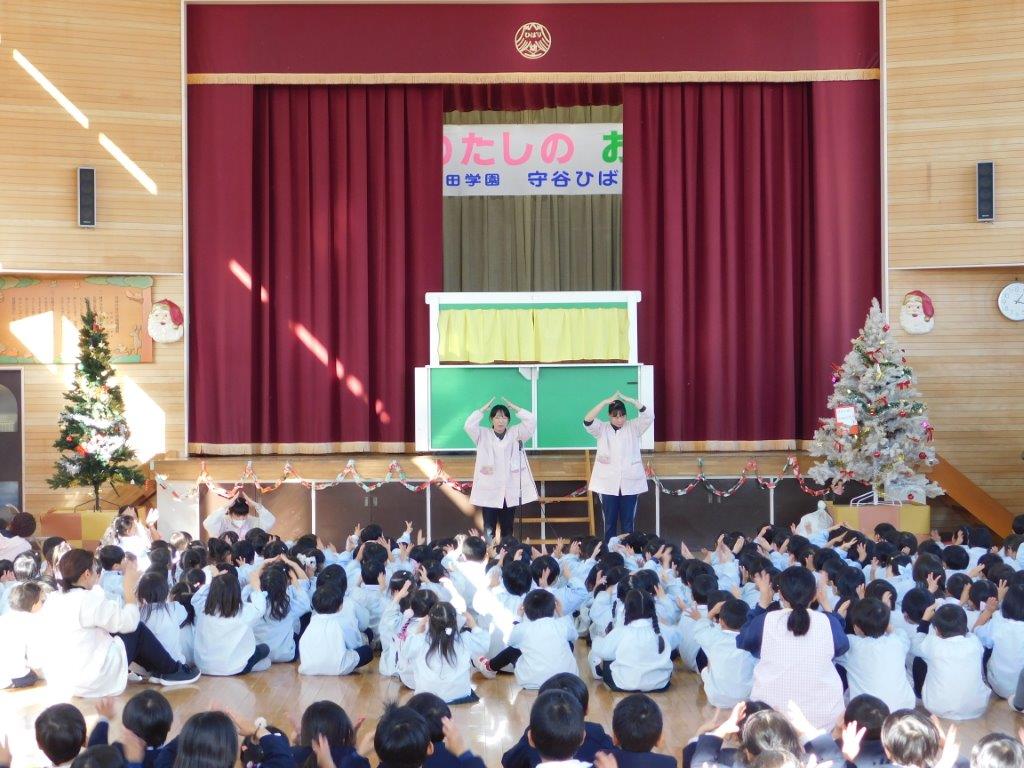 うのサンタクロース」と「赤鼻のトナカイ」のダンスを音楽に合わせてみんなで楽し