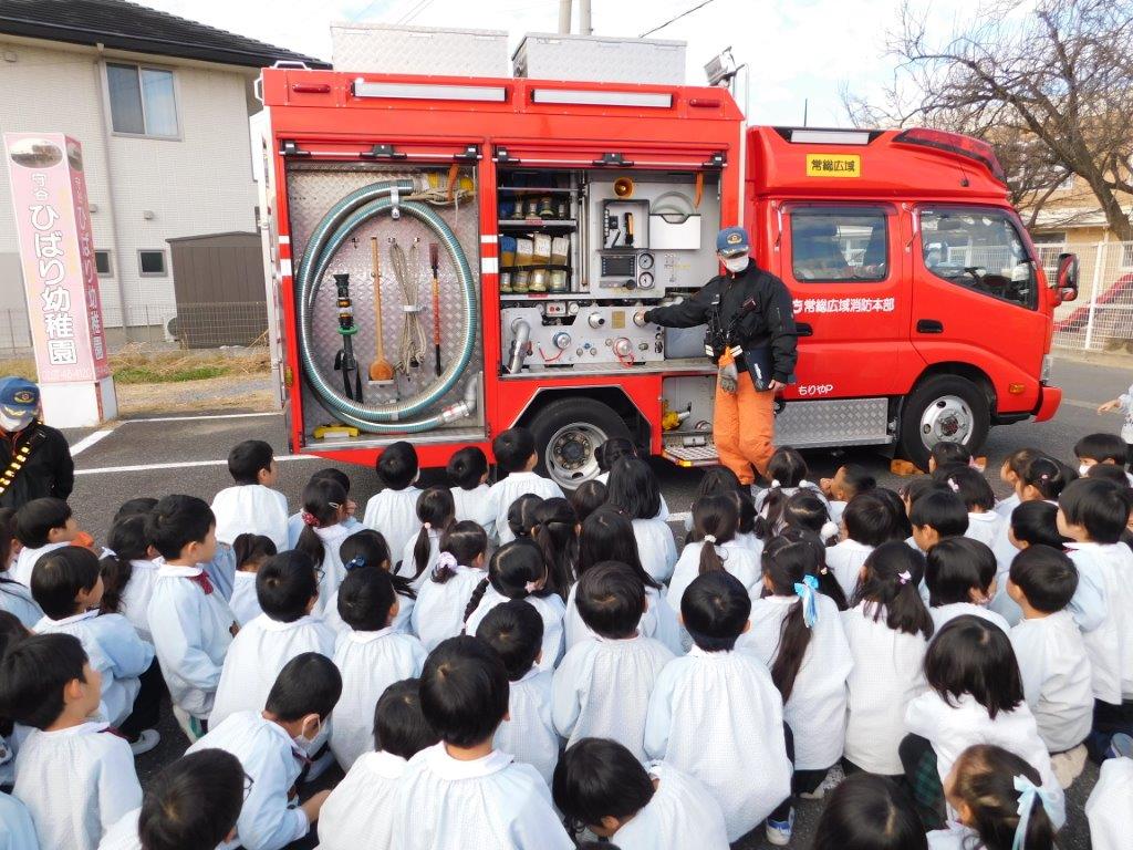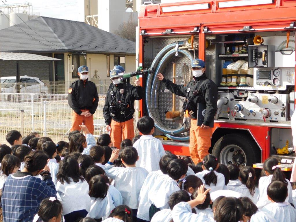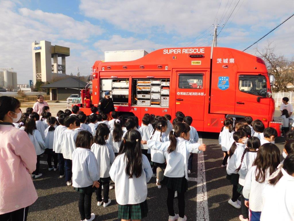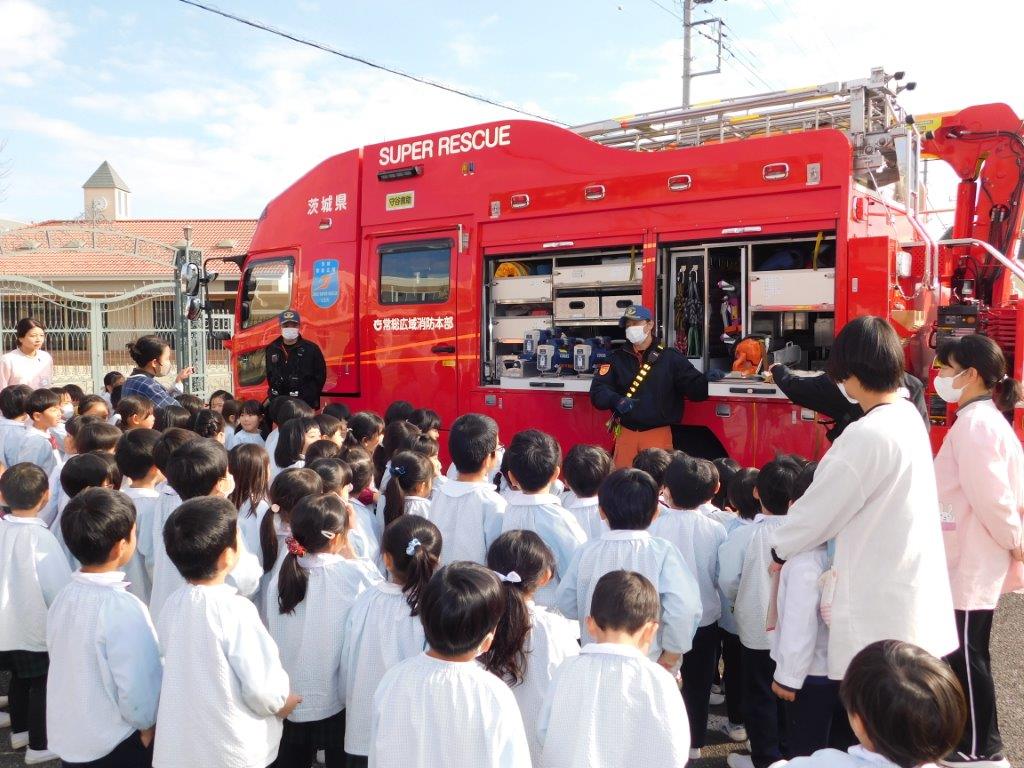 子どもたちは消防車両の見学をしました。最近、火災があちらこちらで多発してりま
