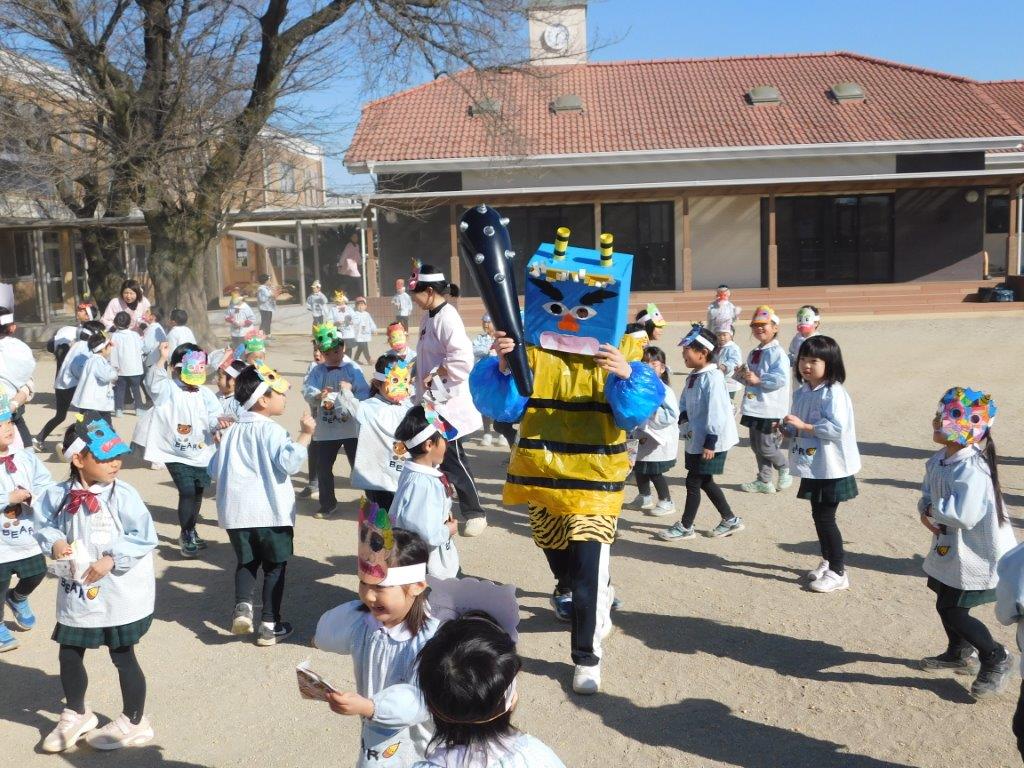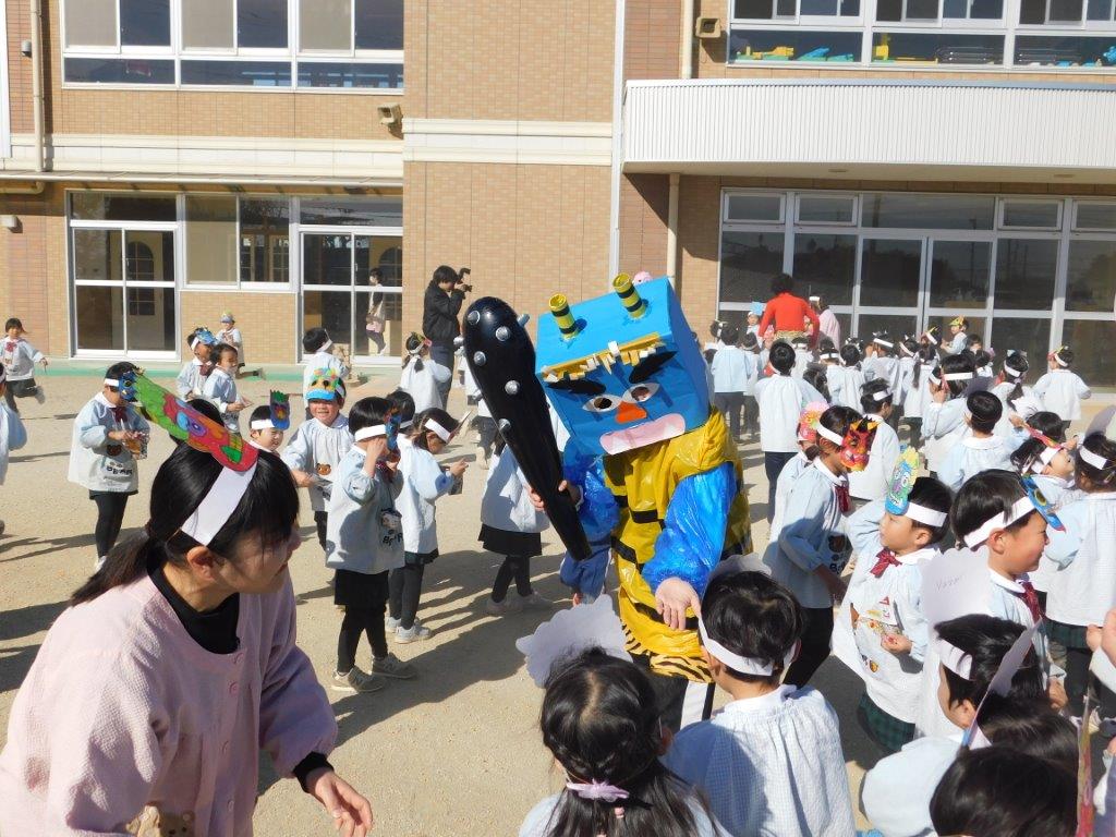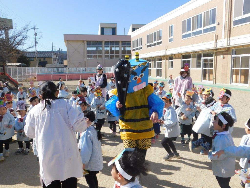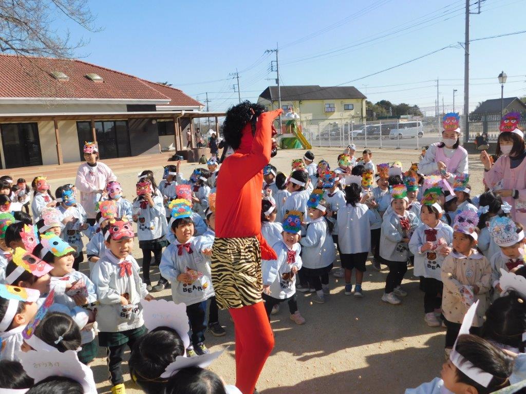 節分ってどんな日? 子どもたちは節分の由来についてのお話を聞きました。その後は「まめまき」の歌 ゛おにはそとふくはうち ぱらっ ぱらっ ぱらっ ぱらっ まめのおと おにはこっそりにげていく゛ と、まめまきの歌を元気よく歌っていると鬼が現われました。子どもたちは早速鬼をめがけて「おにはそと~、ふくはうち~」と豆を投げました。子どもたちが追いかけると鬼は逃げまわりました。年少の子どもたちは「こわいよ~」と泣き出す場面も見られましたが、最後は鬼さんとタッチする場面も・・・思い出に残る節分豆まき集会でした。