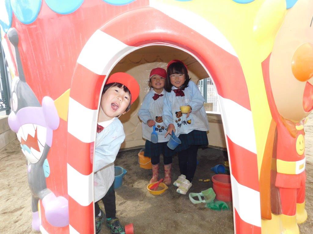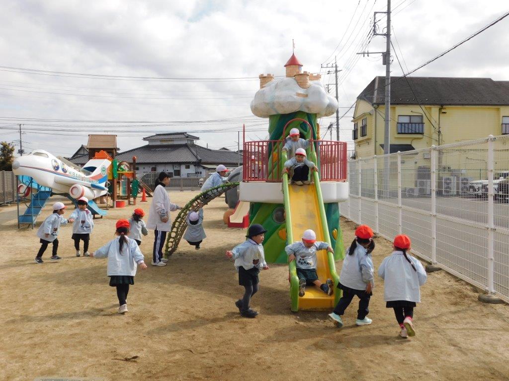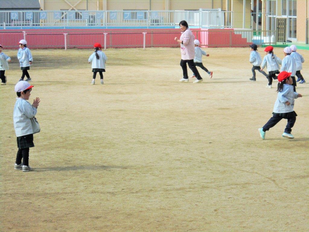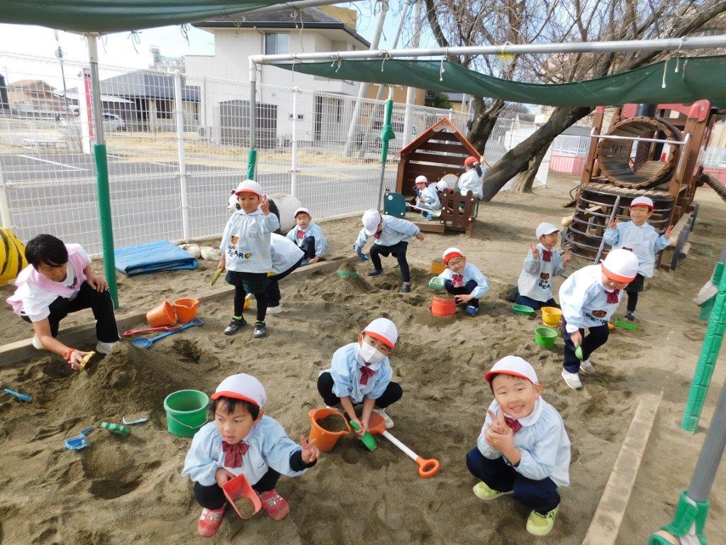 春が少しずつ近づき、河津桜の蕾もふくらみ花が咲き始めました。子どもたちは「ピンクの花かわいいね~」と花を眺めながら春の訪れを感じていました。今日もみんなで外あそびを楽しみました。「みんなで一緒に走ろう!」とお友だちを誘ってマラソンをしたり、「~さん、つかまえちゃうよ~」と追いかけ鬼ごっこあそびをしたり、砂場や遊具ではお友だちや先生と一緒に遊びを発展させながら楽しく遊びました。