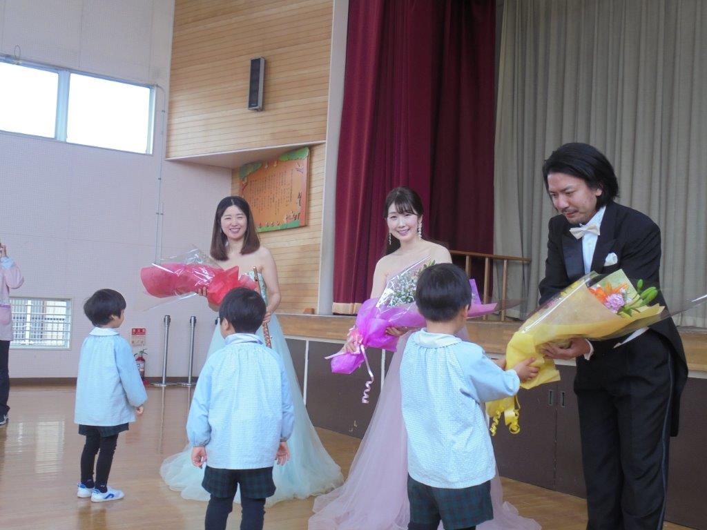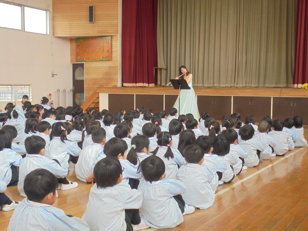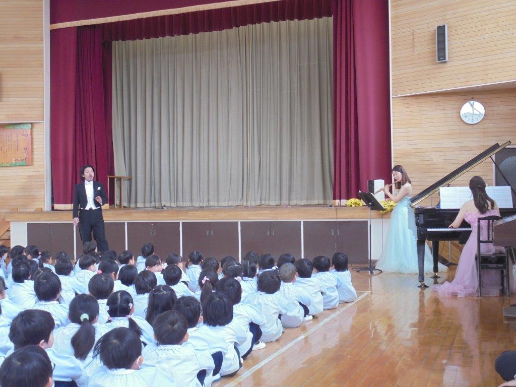 ピアノとフルートの二重奏による「きらきら星」「森の音楽家」アナと雪の女王より「Let it go」ラプンツェルより「輝く未来」アリエルより「アンダーザシー」など、子どもたちのなじみの曲をメドレーで演奏していただき、子どもたちは真剣に聴き入っておりました。歌では「鬼のパンツ」や「パート・オブ・エア・ワールド」を歌っていただき素晴らしい歌声に会場は魅了されました。子どもたちにとっても心に残る音楽コンサートでした。