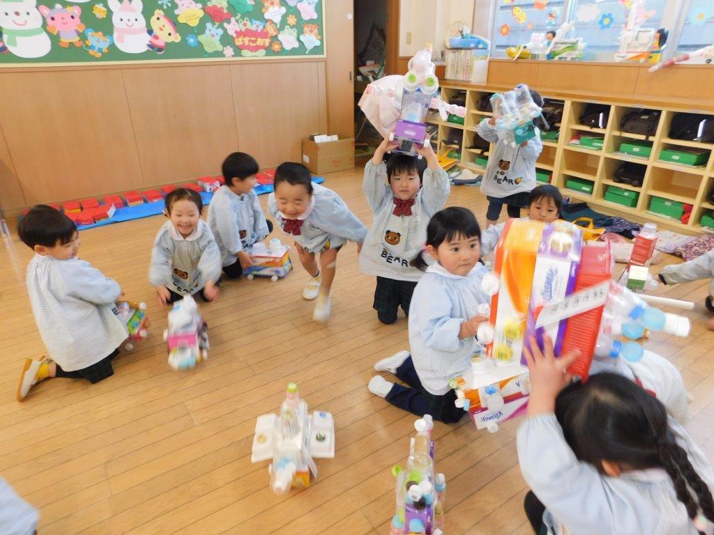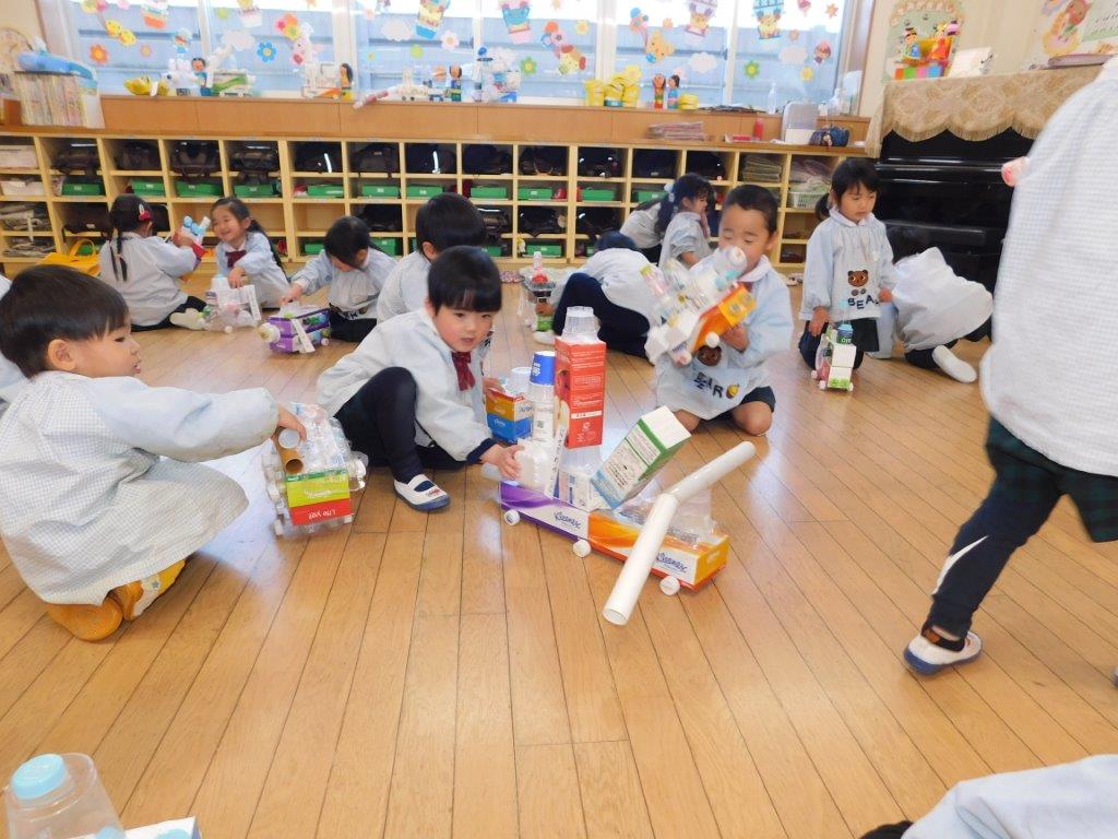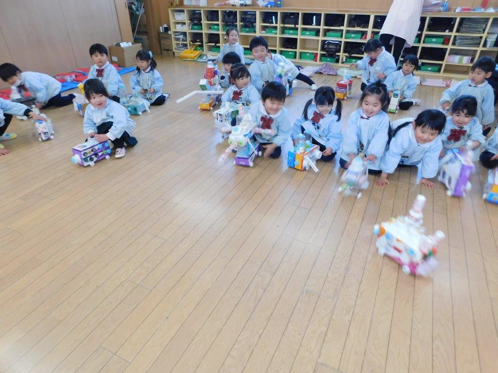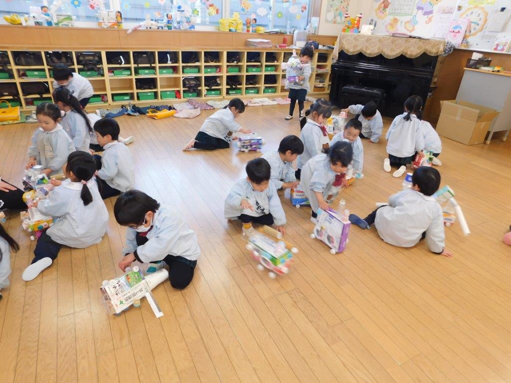 作品展終了後から子どもたちは廃品を活用して工夫しながら作ってあそべるおもちゃづくりが大好きになりました。年少組では手作りおもちゃ(車)を作って遊びました。牛乳パックやティッシュ箱などを組み合わせてタイヤはペットボトルのキャップに穴を開けてタイヤがまわる仕組みです。「この車かっこいいでしょ~」「わたしの可愛い!」「ぼくの車は速いんだよ」と子どもたちは思いおもいの手作りおもちゃで楽しくあそびました。物を大切にするこころ大切にしたいと思います。