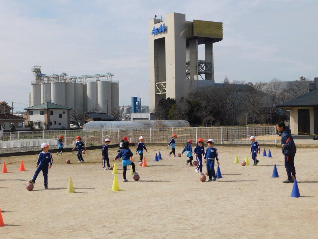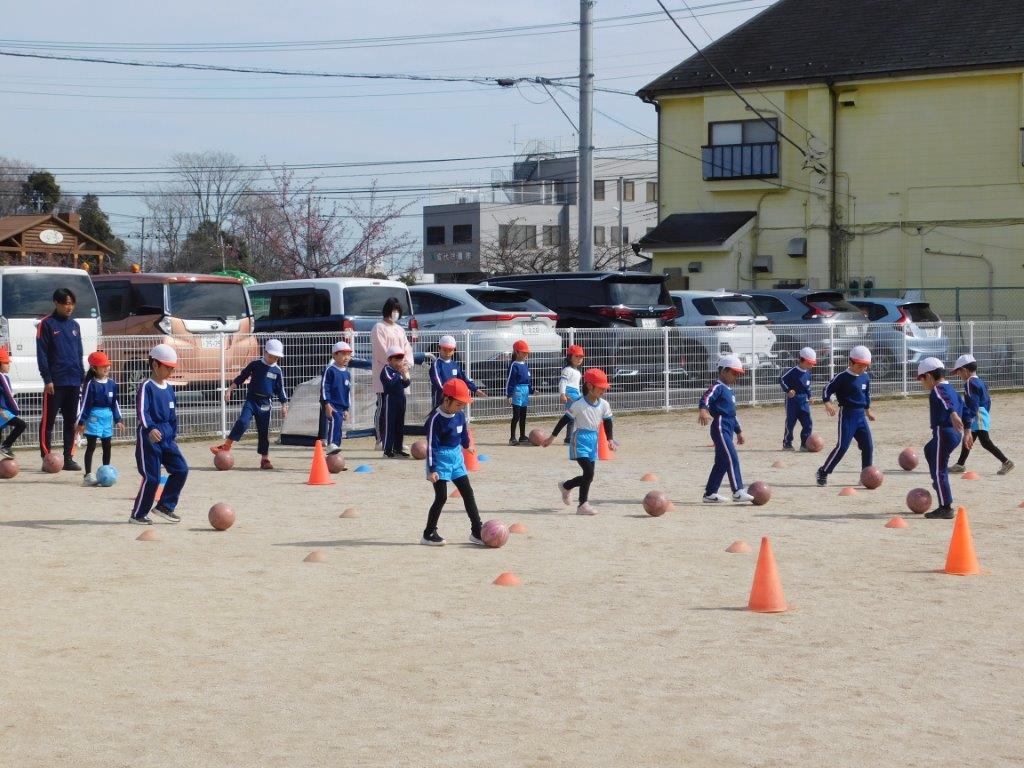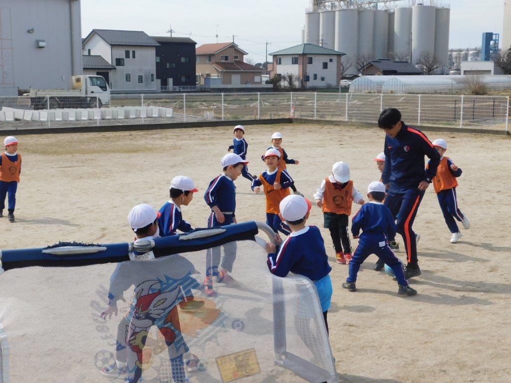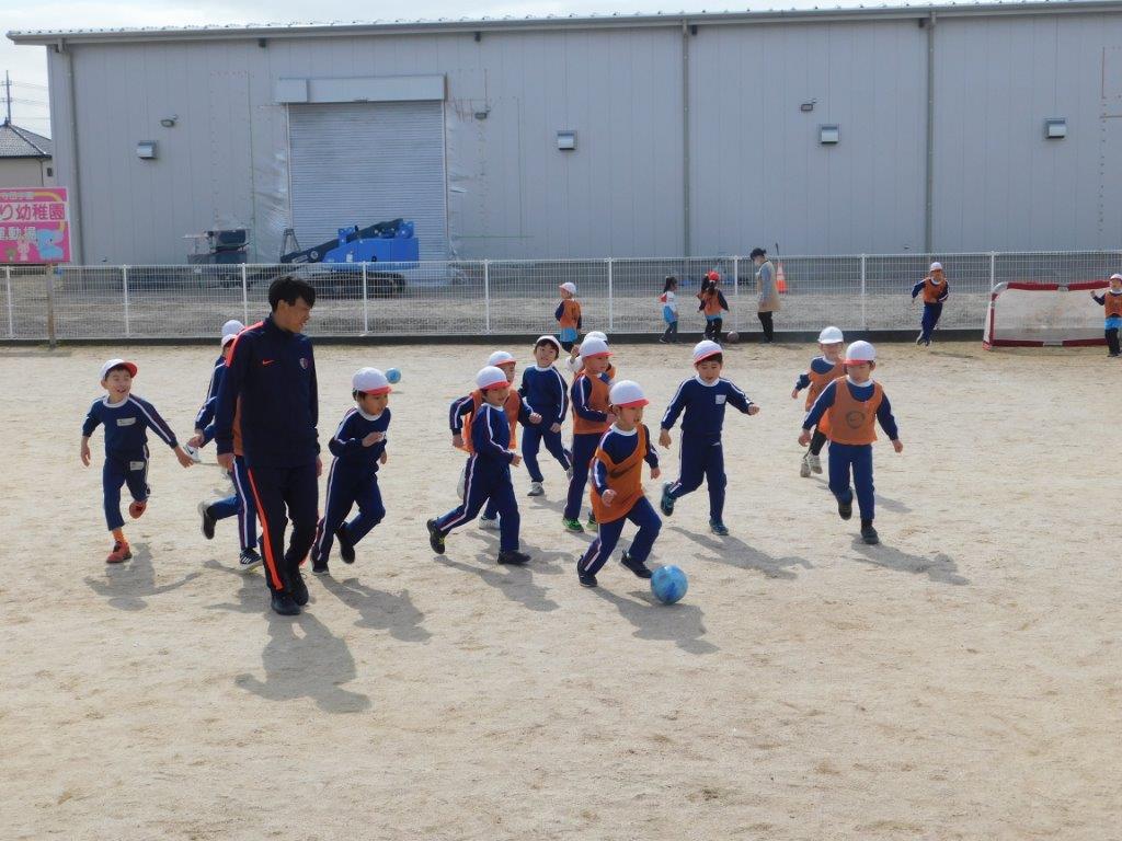 やわらかい日差しにも春が感じられ、園庭の河津桜も咲き始めました。そんななか、鹿島アントラーズの皆さんにお越しいただき年長組のサッカー教室が行われました。今日の練習ではボールに慣れることやボールの扱い方、ドリブルの練習など基本的な練習をくり返し行いました。その後は二班に分かれて試合を行い、子どもたちはボールを目がけて走ったり、キックしてボールをゴールに入れたり、まるでサッカー選手になったかのように真剣そのものでした。指導者からは細かい説明やアドバイスをいただき、とても楽しいサッカー教室でした。