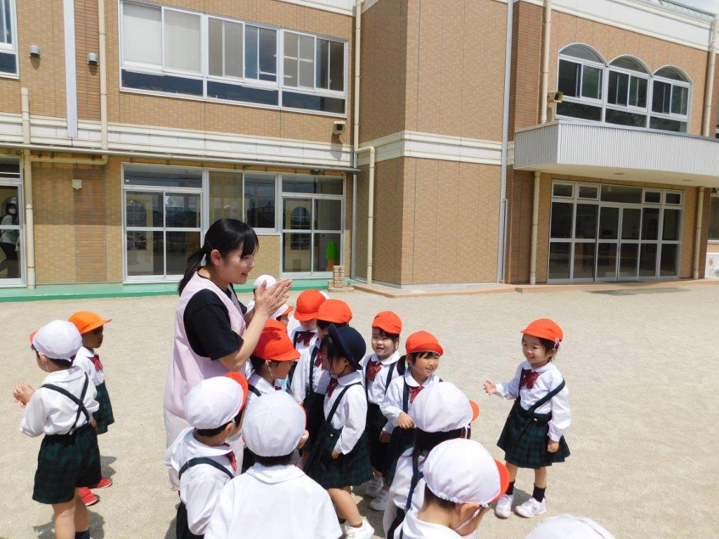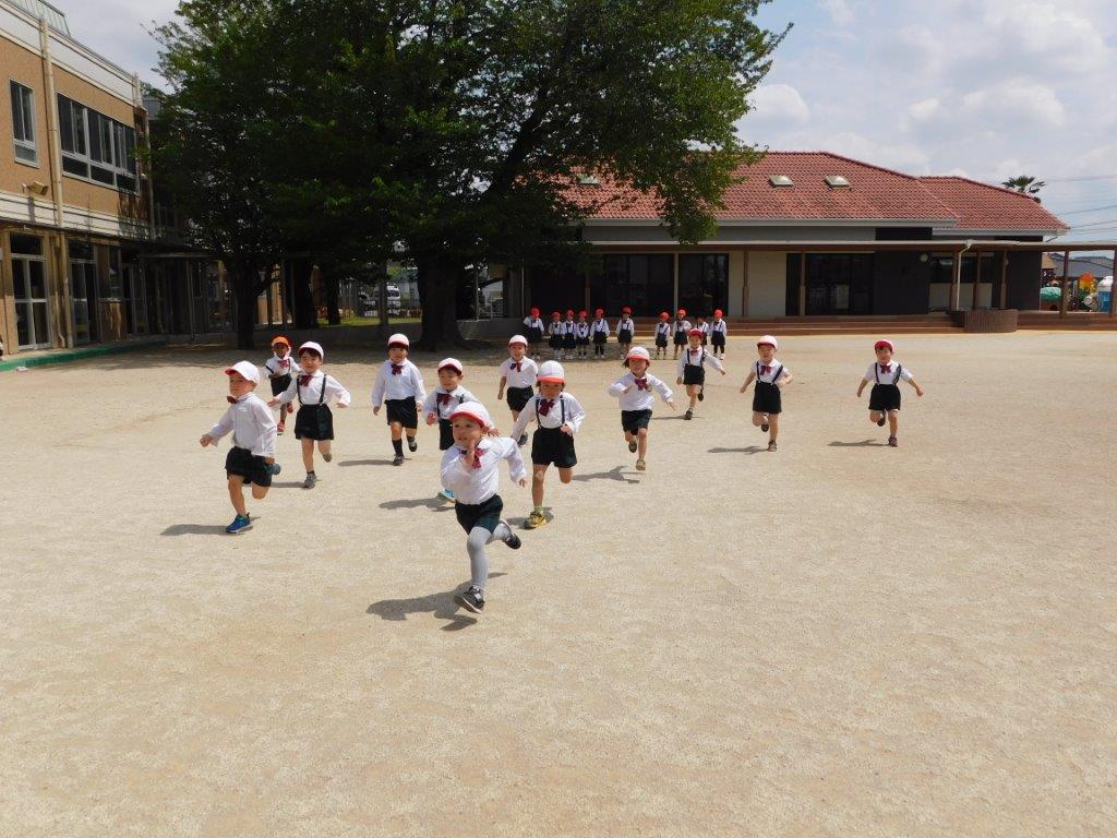 新緑が美しい季節、子どもたちは園庭あそびを楽しみました。今日は並びっこの練習をするクラスや園庭遊具で遊ぶクラス、園庭を思いっきり走って鬼ごっこあそびをするクラス、八重桜の花びらをたくさん集めて手の平にのせて「フウッ~」と花吹雪のように飛ばして遊んだり、ひとつの遊びから発展性をもって楽しく遊びました。