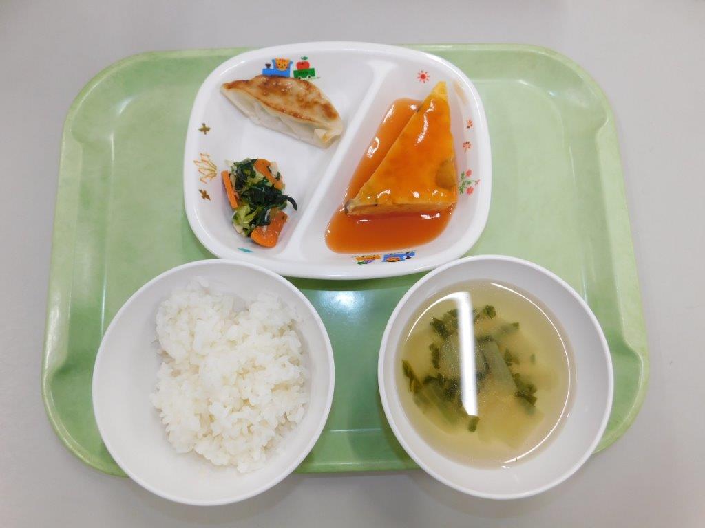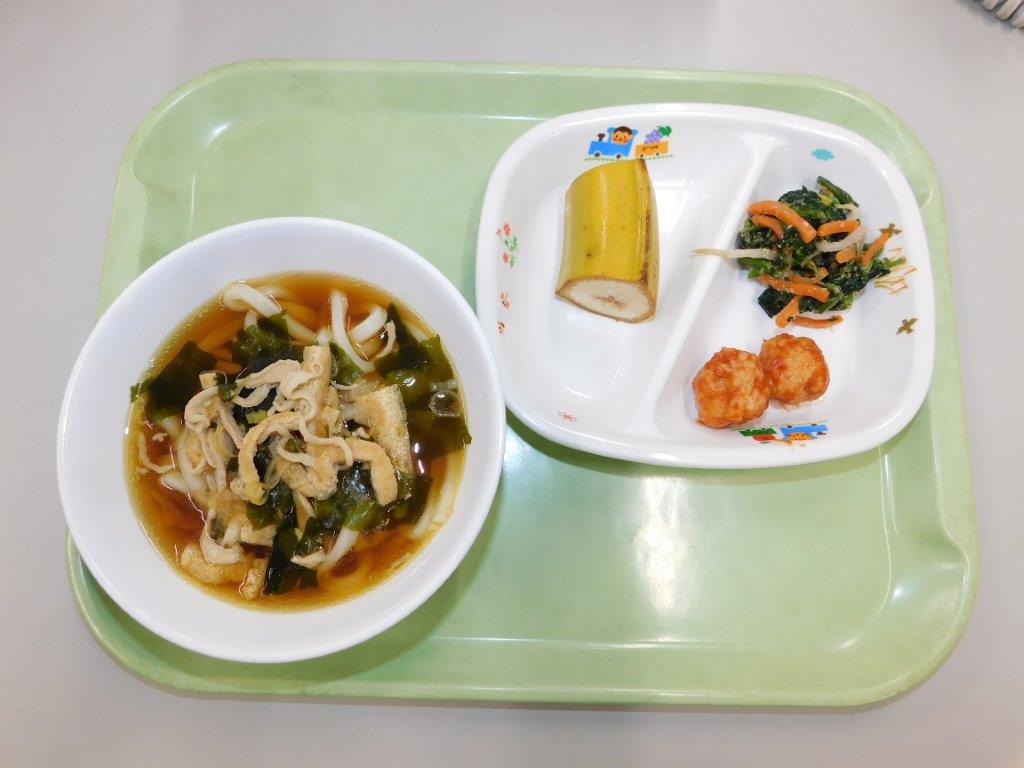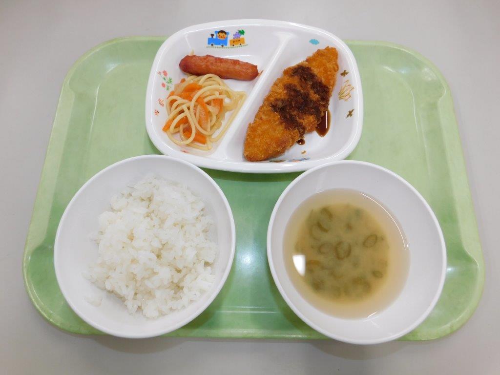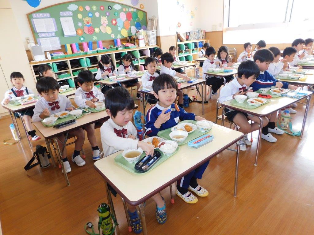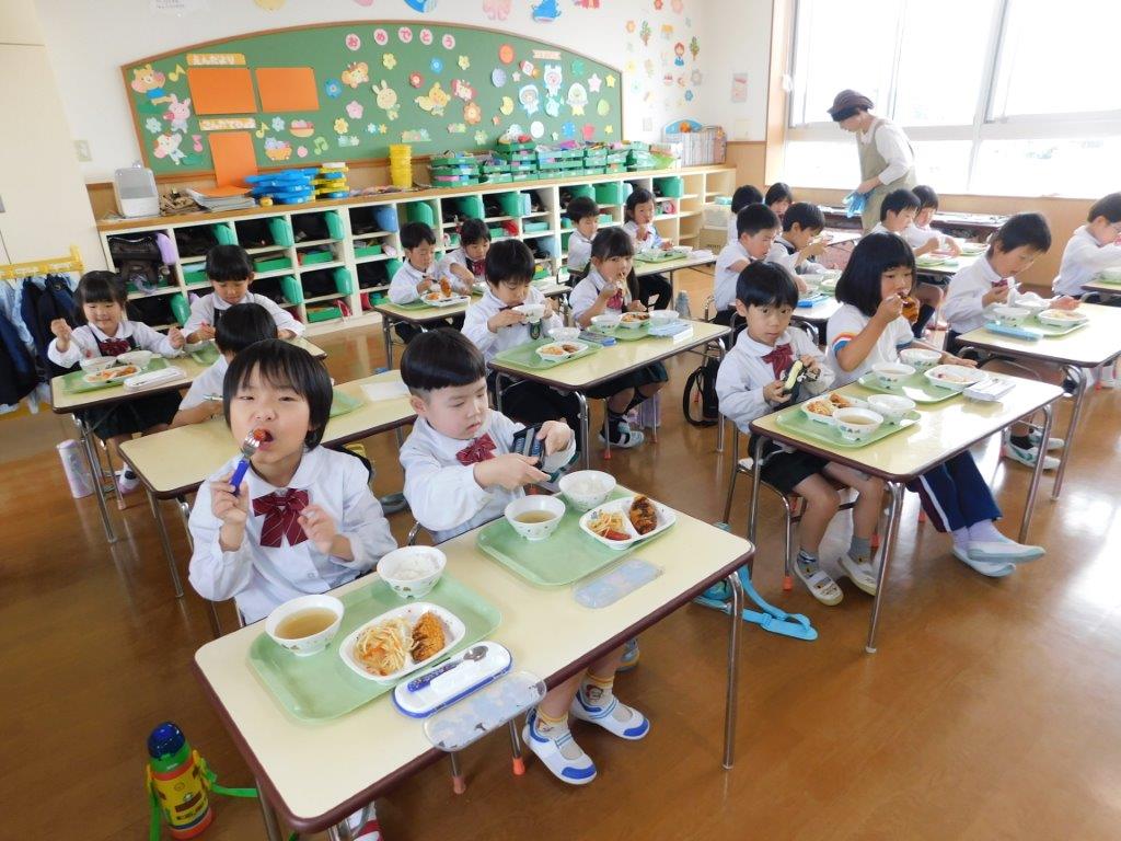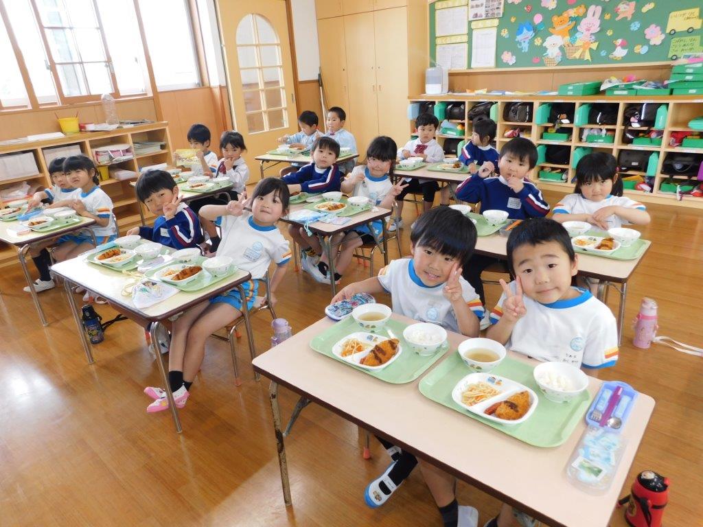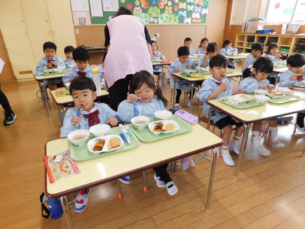 今日もお昼近くになると厨房の方からいい匂いが漂ってきました。今日の給食のおいしそうな匂いです。子どもたちはワクワク!「今日の給食はなにかな?」なんとなくお腹がすいてきた時間です。するとオーウェン講師の英語教室からも「I’m hungry」の元気のよい声が聞こえてきました。いよいよ今日も楽しみな昼食の時間です。今日の献立はご飯、味噌汁、白身魚フライ、和風サラダスパゲティー、ウインナーでした。白身魚のフライもサクサクとしてとてもおいしかったです。みんなで一緒にいただく昼食の時間を子どもたちは毎日楽しみにしています。年長組はいよいよランチルームでの会食が始まります。楽しみですね。